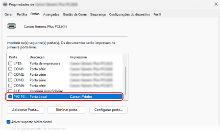 Se o endereço IP da máquina for alterado após a instalação do controlador da impressora, será necessário adicionar uma nova porta.