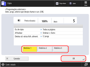 No ecrã [Progr. anteriores], selecione o histórico que deseja recuperar e prima [OK].
