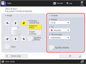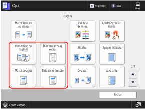 Pode adicionar informações como números de página e data ao copiar. Também pode adicionar uma marca d'água como "CONFIDENTIAL". Também pode especificar uma sequência personalizada para a marca d’água.