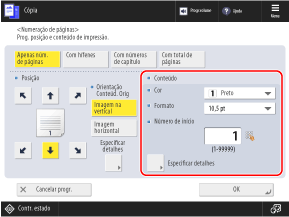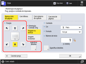 Pode pressionar [Especificar detalhes] e definir as configurações para adicionar uma frase personalizada aos números de página ou especificar o intervalo de páginas a serem impressas.