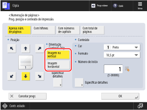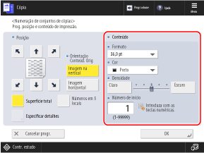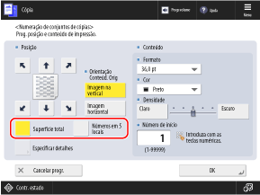 * Não pode selecionar [Superfície total] e [Números em 5 locais] se as configurações estiverem configuradas para adicionar outras informações aos números do conjunto de cópias.