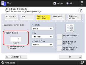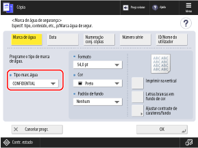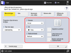 Pode pressionar [Ajustar contraste de carateres/fundo] para ajustar o contraste (equilíbrio de densidade) da marca d'água segura e do fundo.