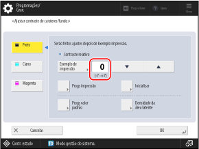Carregue em [Programações de funções] [Comum] [Programações de impressão] [Progr. marca água de segur.] [Ajustar contraste de carateres/fundo].