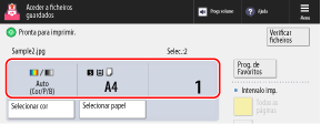 A cor de impressão atualmente definida, o papel a ser usado e o número de impressões são exibidos no centro do ecrã. Verifique estas definições para garantir a impressão correta.