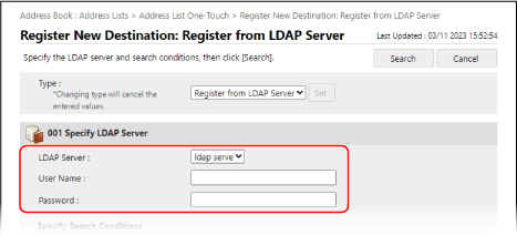 В разделе [Type] выберите [Register from LDAP Server] и щелкните [Set].