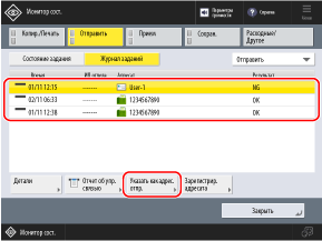 Вы можете указать адресатов, использовавшихся ранее, вызвав журнал передачи на экране [Монитор сост.] панели управления.
