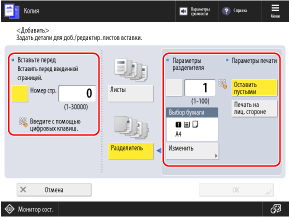 Вы можете вставлять листы и бумагу для разделителей на страницу с одним и тем же номером. В этом случае аппарат вставляет лист перед бумагой для разделителей.