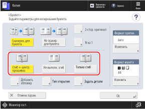 Кроме того, можно настроить такие параметры окончательной обработки, как фальцовка страниц копии буклета пополам и сшивание в месте сгиба (центральная прошивка).