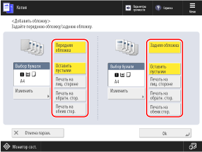 На экране копирования нажмите [Параметры] [Добавить обложку]. Экран копирования