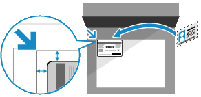 При копировании ИД-карты поместите ее на стекло экспонирования лицевой стороной вниз. Поместите ИД-карту в альбомной ориентации, совместив угол ИД-карты с верхним левым углом стекла экспонирования и оставьте небольшое пространство между ИД-картой и краями стекла экспонирования.