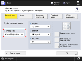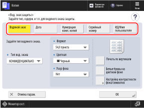 На экране копирования нажмите [Параметры] [Вод. знак защиты]. Экран копирования