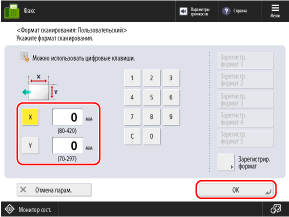 Нажмите [Зарегистрир. формат]  выберите кнопку, для которой хотите зарегистрировать формат  нажмите [Регистр./Правка]  введите длину сторон [X] и [Y]  нажмите [OK]  [Закрыть]