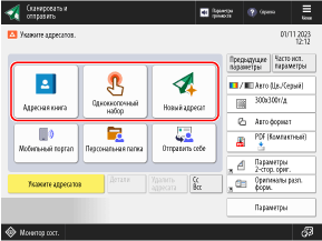Вы можете нажать [Предыдущие параметры], чтобы вызвать параметры, которые использовались для отправки сканированных данных в прошлом. Вместе с вызываемыми параметрами также применяется выбор адресата для отправки.