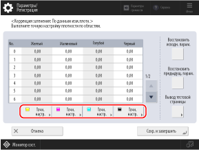 Если пробная страница после коррекции имеет неравномерную плотность, выполните визуальную коррекцию. Коррекция путем ввода значений плотности (визуальная коррекция)