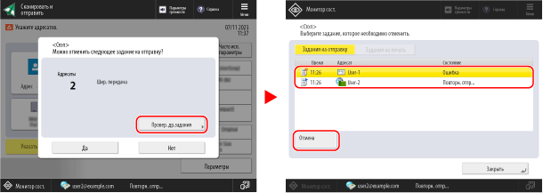 Чтобы отменить другое задание, нажмите [Провер. др.задания], выберите задание для отмены в списке «Задание на отправку» и нажмите [Отмена].