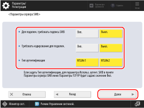 * Если для этого параметра установлено значение [Вкл.], невозможно подключиться к Супер-ячейка из клиентской операционной системы, которая не поддерживает соединение с шифрованием SMB v3.0.