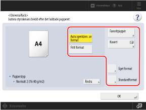 Om pappersformatet som fylls på inte identifieras automatiskt eller om ett annat pappersformat visas efter att du har fyllt på papperet ska du trycka på [Standardformat] och välja pappersformat.
