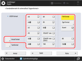 Se följande för pappersformaten som visas när [Annat format] trycks in: