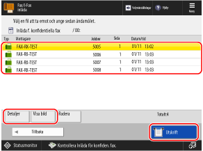 Välj ett fax och tryck på [Visa bild] för att visa en förhandsgranskningsskärm och kontrollera innehållet i faxet.