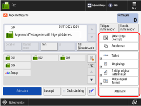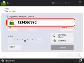 När du anger faxnumret kan du använda inställningar såsom [Ton] och [Paus] beroende på sändningsmottagaren och den tjänst du använder. Inställningar för faxmottagare
