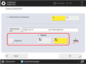 Om du anger en e-postadress eller fillagringsplats, vidarebefordras eller lagras fax som TIFF- eller PDF-filer.