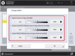 Om färgtätheten för skannade data eller utskriftsresultat skiljer sig avsevärt från källdata eller original, utför korrigering så att tätheten vid skanning är närmare den för originalet. Du kan korrigera tätheten för varje funktion.