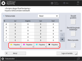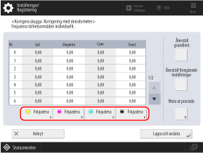 Kontrollera visuellt färgproverna på provsidan för att bestämma densitetsvärdena (justeringsvärden) och ange ett densitetsvärde för varje nummer.