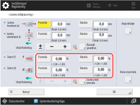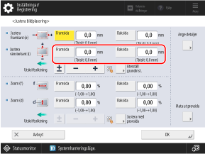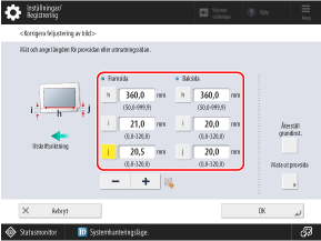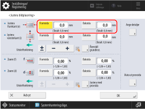 * Om du ser skärmen [Justera bildplacering] efter att ha justerat vänser kant eller justerat framkanten, återställs värdet på skärmen till "0,0 mm" och det tidigare inställda värdet sparas. Om du vill upprepa justeringen, kontrollerar du indikatorn på den återutskrivna provsidan och anger värdet.