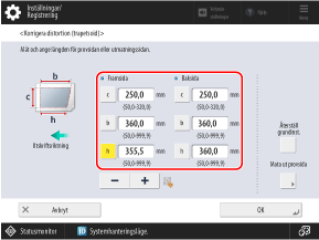 Vid utförande av korrigering av bildfelinställning, korrigering av distorsion (parallellogram) eller korrigering av distorsion (trapetsoid)