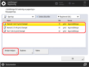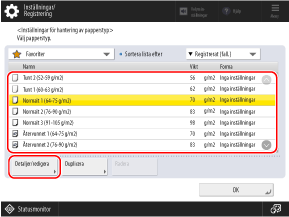Välj det registrerade pappret i listan och tryck på [Detaljer/redigera].