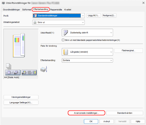 Klicka på [Avancerade inställningar] på fliken [Efterbehandling].