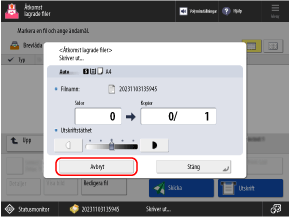 Om [Lista över utskriftsjobb] visas, välj det jobb som ska avbrytas från utskriftsjobblistan och tryck på [Avbryt].