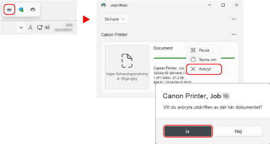 Om ovanstående skärm inte visas, dubbelklicka på skrivarikonen i Windows meddelandefält, välj dokumentet som ska avbrytas och högerklicka på [Avbryt] klicka på [Ja].
