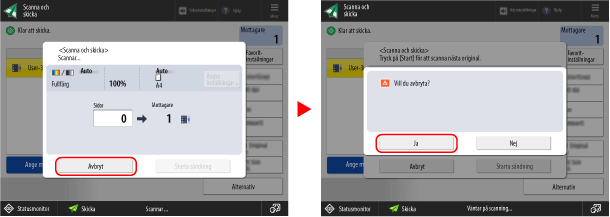 För att avbryta ett annat jobb trycker du på [Kontrollera andra jobb], väljer jobbet som ska avbrytas från listan Sänd jobb och trycker på [Avbryt].