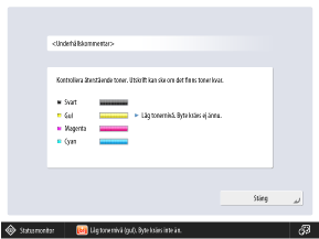 Tills du tar bort meddelandeskärmen kommer den att visas varje gång maskinen går ur viloläget eller huvudströmmen slås på. För att ta bort meddelandeskärmen behöver du genomföra åtgärden [Ta bort fel om återstående toner]. [Ta bort fel om återstående toner]
