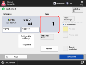 När flera filer väljs i steg 5, tryck på [Ändra antal kopior] och ange antalet utskrifter.