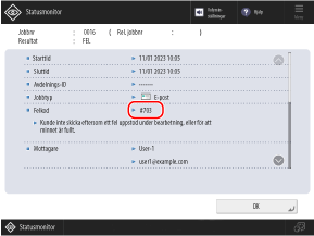 Om felmeddelande visas från SMTP-servern när du skickar ett I-Fax med hjälp av Komplett läge ska du kontrollera informationen och vidta åtgärder.