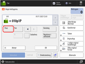 klicka på [Settings/Registration] [Send] [TX Settings - Fax Settings] i [Set Pause Time], ange paustid klicka på [OK] |