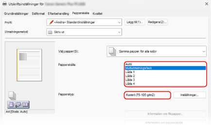 I [Papperskälla] och [Papperstyp] på fliken [Papperskälla] väljer du universalfacket och kuvertet.