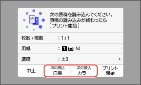 1 | 原稿台ガラスに次の原稿をセットし、[次の読込 白黒]または[次の読込 カラー]を押す 次の原稿がスキャンされ、同じ画面が表示されます。 すべての原稿のスキャンが完了するまで、この操作を繰り返します。 原稿ごとにカラーモード(白黒/カラー)を選択できます。次の原稿を白黒でコピーする場合は[次の読込 白黒]を、カラーでコピーする場合は[次の読込 カラー]を押します。 [濃度]/[原稿の種類]/[カラー調整]を押して、原稿ごとに設定を変更することもできます。 原稿ごとのサイズが異なる場合は、画像が欠けたり、用紙に対して画像が小さくプリントされたりすることがあります。 |