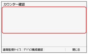 カウンター確認の画面で行うことができる操作[遠隔監視サービス]を押すと、遠隔監視サービス「NETEYE」(ネットアイ)に関する操作を実行できます。NETEYEを利用するには、申し込みが必要です。 NETEYE[デバイス構成確認]を押すと、本機のシリアル番号を確認できます。
