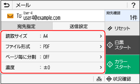 | | 原稿をスキャンして、スキャンデータをメールに添付して送信します。 通常のメール送信と同様に、複数の宛先を指定できるほか、件名や本文も設定できます。 |