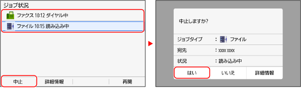 ジョブの一覧画面が表示された場合は、中止するジョブを選択し、[中止]