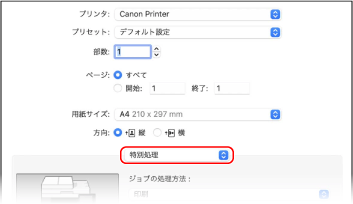 2 | プリントオプションのポップアップメニューから[特別処理]を選択する プリントオプションが表示されていない場合は、プリントダイアログの[詳細を表示]をクリックします。 |