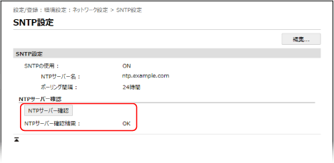 NTP/SNTPサーバーと通信できるか確認する以下の手順で確認します。正しく通信できている場合は、[NTPサーバー確認結果]に[OK]と表示されます。 リモートUIに管理者モードでログイン  [設定/登録]  [ネットワーク設定]  [SNTP設定]  [NTPサーバー確認]をクリック |