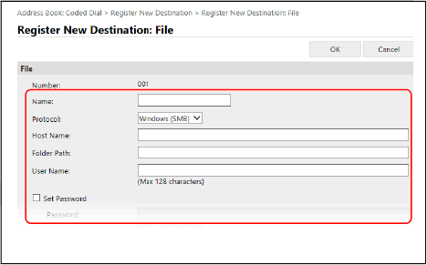 5 | Enter the user name and password, as needed. If Restrict Access is enabled for the shared folder or FTP server, enter the user name and password used for accessing the shared folder or FTP server. To enter a password, select the [Set Password] checkbox, and then enter the password. |