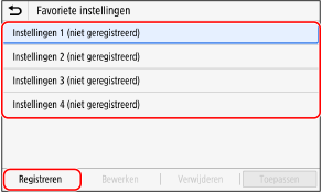 U kunt instellingen voor uw bedoeling registreren en instellingen die u wilt oproepen als ‘Favoriete instellingen’ voor de scan-, fax-, en kopieerfuncties.