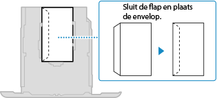 Plaats de enveloppen No. 10 (COM10), Monarch, ISO-C5, of DL in staande afdrukrichting met de voorkant (kant zonder lijm) omhoog gericht en de lange kant van de envelop parallel met de lange kant van de papierlade. Plaats de envelop met de klep gesloten en aan de linker kant.