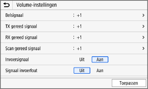 U kunt het volume aanpassen van het geluid voor een inkomende fax en de geluiden die u informeren dat er faxen zijn verzonden en ontvangen, en wanneer originelen zijn gescand.