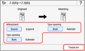 3 | Stel de afdrukstand en het openingstype in en druk op [Toepassen]. Het scherm [Andere instellingen] verschijnt weer. |